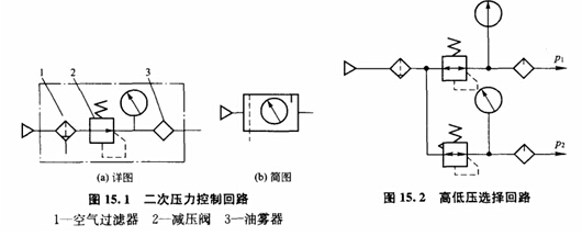 在實(shí)際應(yīng)用中,某些氣功控制系統(tǒng)需要有不同壓力的選擇。例如,在加工塑料門窗的三點(diǎn)焊機(jī)的氣動(dòng)控制系統(tǒng)中,用于控制工作臺(tái)移動(dòng)的回路的工作壓力為0.25MPa~0.3MPa,而用于控制其他執(zhí)行元件的回路的工作壓力為0.5MPa~0.6MPa。這種情況可采用如圖15.2所示的高、低壓選擇回路。該回路只要分別調(diào)節(jié)兩個(gè)減壓閥,就能得到所需要的高壓和低壓輸出。