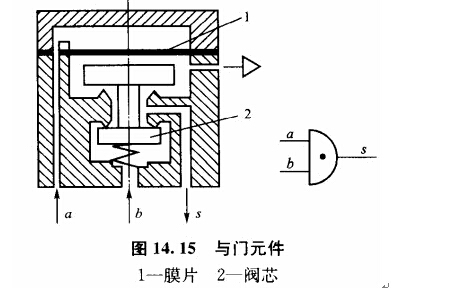圖1 4. 15所示為與門元件的原理圖和圖形符號。從與門元件的原理圖可知,它與是門兀件相同,只是把氣源口P改為信號b。其工作原理是當有輸入信號a,而沒有信號b時,在信號壓力U的作用下通過使膜片4變形而使閥芯2下移,輸出端s與b相連,無輸出信號;當有輸入信號b.但沒有信號α時,閥芯2上移,輸出端也無輸出信號。只有當輸入信號α和b同時存在,由于信號作用的有效面積不等,閥芯2下移,輸出端才有輸出信號。