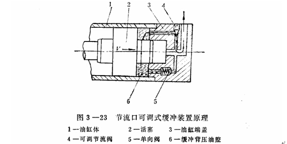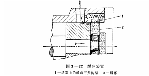 圖3-22是活塞頭部帶有軸向三角節(jié)流溝梢的緩沖裝置。當活塞運動到接近終點時將回油路封閉,油缸中剩下的油液只能通過三角狗槽流出,形成液壓阻力;钊酵耙,阻力越大,直至移動部件停止運動。也有在油缸端部加可調(diào)節(jié)流間,使油缸中被封閉的油液經(jīng)可調(diào)節(jié)流閥口流出,這樣便可按負載慣性力大小適當調(diào)節(jié)緩沖背壓,其工作原理示于圖3-23。