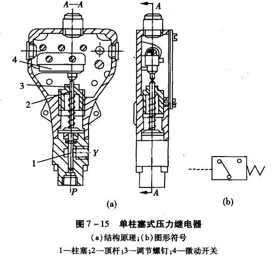 圖7 -15 (a)為單柱塞式壓力繼電器的結(jié)構(gòu)原理圖。壓力油從油口P進(jìn)入,并作用于柱塞1的底部,當(dāng)壓力達(dá)到彈簧的調(diào)定值時(shí),便克服彈簧阻力和柱塞表面摩擦力,推動(dòng)柱塞上升,通過頂桿2觸動(dòng)微動(dòng)開關(guān)4發(fā)出電信號(hào)。圖7 -15(b)為壓力繼電器的圖形符號(hào)。