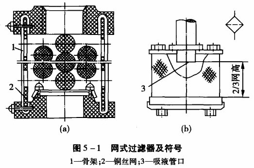 (1)網(wǎng)式過濾器。如圖5 -1所示為網(wǎng)式過濾器,在塑料或金屬筒形骨架1上包著一層或兩層銅絲網(wǎng)2,過濾精度由網(wǎng)孔大小和層數(shù)決定。這種過濾器的特點是:結(jié)構(gòu)簡單,通流能力大,清洗方便,壓力損失小(一般小于0.025 MPa),缺點是過濾精度低(一般過濾精度為0.08 -0.18 mm)。