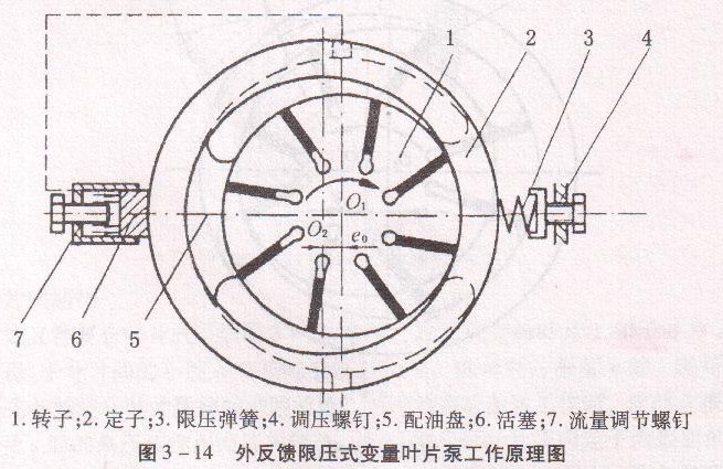 單作用式葉片泵的變量方法是改變其偏心距e的大小,偏心距可通過手動調節(jié),也可自動調節(jié)。自動調節(jié)的變量泵可根據(jù)其工作特性的不同分為限壓式、恒壓式和恒流量式三類,其中以限壓式應用較多。