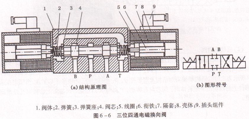 如圖6 -6(a)所示為三位四通電磁換向閥的結構原理圖。閥的兩端各有一個電磁鐵和一個對中彈簧。閥芯在常態(tài)時處于中位。當右端電磁鐵通電時,右銜鐵6通過推桿將閥芯4推至左端,閥右位工作,其油口P通B,A通T;當左端電磁鐵通電時,閥芯移至右端,閥左位工作,油口P通A, B通T。圖6 -6(b)為三位四通電磁換向閥的圖形符號。